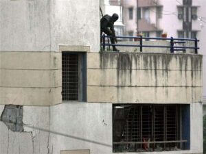 ଏହି ଫଟୋରେ ନଭେମ୍ବର ୨୮, ୨୦୦୮ରେ ମୁମ୍ବାଇର ନରିମନ ହାଉସର ଚତୁର୍ଥ ମହଲାରେ ବିସ୍ଫୋରଣ ପରେ ନ୍ୟାସନାଲ ସିକ୍ୟୁରିଟି ଗାର୍ଡ କମାଣ୍ଡୋ ଝରକା ଆଡ଼କୁ ଲକ୍ଷ୍ୟ ରଖିଥିବାର ନଜର ଆସିଛନ୍ତି।