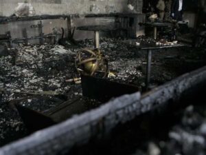 ନଭେମ୍ବର ୨୯, ୨୦୦୮ରେ ମୁମ୍ବାଇରେ ଆତଙ୍କବାଦୀଙ୍କୁ ହଟାଇବା ପରେ ତାଜହୋଟେଲ ଭିତରର ଦୃଶ୍ୟ। ଏହି ଆକ୍ରମଣରେ ତାଜ ହୋଟେଲରେ ୪୦୦ କୋଟିରୁ ଅଧିକ ଟଙ୍କାର କ୍ଷତି ହୋଇଥିଲା।