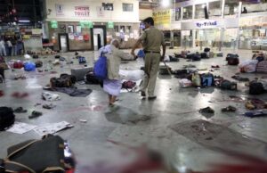 ଏହି ଫଟୋରେ ୨୬ ନଭେମ୍ବର ୨୦୦୮ରେ ମୁମ୍ବାଇର ଛତ୍ରପତି ଶିବାଜୀ ରେଳ ଷ୍ଟେସନରେ ଅଜ୍ଞାତ ଆକ୍ରମଣକାରୀଙ୍କ ଗୁଳି ବିନିମୟ ପରେ ଜଣେ ପୁଲିସ ବୃଦ୍ଧଙ୍କୁ ଧରି ନେଉଥିବାର ନଜର ଆସିଛନ୍ତି। ଛତ୍ରପତି ଶିବାଜୀ ରେଳ ଷ୍ଟେସନରେ ଗୁଳି ମାଡ଼ରେ ପ୍ରାୟ ୫୮ ଜଣଙ୍କର ମୃତ୍ୟୁ ଘଟିଥିଲା। ଫଟୋରେ ଷ୍ଟେସନରେ ସବୁ ସ୍ଥାନରେ ଛିନ୍ନ ବିଚ୍ଛିନ୍ନ ହୋଇ ଜିନିଷ ପଡ଼ିଥିବା ଏବଂ ଅନେକ ରକ୍ତ ଦାଗ ଦେଖାଯାଉଛି।