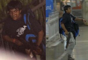 ଏହି ଦୁଇ ଫଟୋରେ ୨୦୦୮ ମସିହା ନଭେମ୍ବର ୨୬ ତାରିଖରେ ମୁମ୍ବାଇର ଛତ୍ରପତି ଶିବାଜୀ ଟର୍ମିନାଲ ରେଳ ଷ୍ଟେସନ ପରିସରରେ ଆତଙ୍କୀ ଅଜମଲ ଆମୀର କସାବ ବୁଲୁଥିବା ନଜର ଆସିଛି। ଛତ୍ରପତି ଶିବାଜୀ ରେଳ ଷ୍ଟେସନରେ ଘଟିଥିବା ଗୁଳିକାଣ୍ଡରେ ଅଜମଲ ଆମୀର କସାବ ଏବଂ ଇସ୍ମାଇଲ ଖାନ ସମ୍ପୃକ୍ତ ଥିଲେ। ଅପରେସନ ସମୟରେ ସୁରକ୍ଷା ବାହିନୀଙ୍କ ଗୁଳିରେ ଇସ୍ମାଇଲ ଖାନ ନିହତ ହୋଇଥିବାବେଳେ ଅଜମଲ ଆମୀର କସାବକୁ ଜୀବନ୍ତ କାବୁ କରାଯାଇଥିଲା। କସାବଙ୍କ ବିରୋଧରେ ଦୀର୍ଘ ଦିନ ଧରି ମୋକଦ୍ଦମା ଚାଲିଥିଲା ଏବଂ ପରେ କୋର୍ଟ ତାକୁ ମୃତ୍ୟୁଦଣ୍ଡ ଦେଇଥିଲେ। ଏହାପରେ ୨୦୧୨ ମସିହା ନଭେମ୍ବର ୨୧ ତାରିଖରେ ପୁଣେର ୟେରୱାଡା ଜେଲରେ ତାକୁ ଫାଶୀ ଦିଆଯାଇଥିଲା।