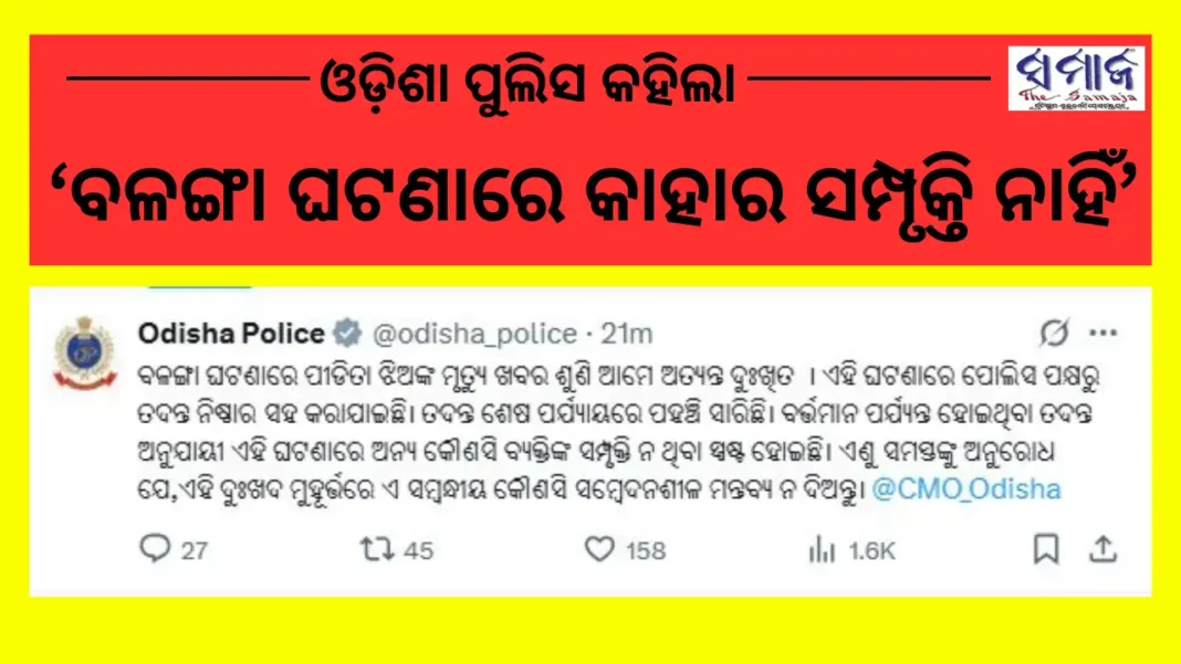 ବଳଙ୍ଗା ପୀଡ଼ିତାଙ୍କ ମୃତ୍ୟୁ ପରେ ମୁହଁ ଖୋଲିଛି ଓଡ଼ିଶା ପୁଲିସ। ଏହି ଘଟଣାରେ ଅନ୍ୟ କୌଣସି ବ୍ୟକ୍ତିଙ୍କର ସମ୍ପୃକ୍ତି ନାହିଁ ବୋଲି ପୁଲିସ ବିଭାଗ ପକ୍ଷରୁ ସାମାଜିକ ଗଣମାଧ୍ୟମ ଏକ୍ସ’ରେ ଏକ ପୋଷ୍ଟ କରି କୁହାଯାଇଛି।
