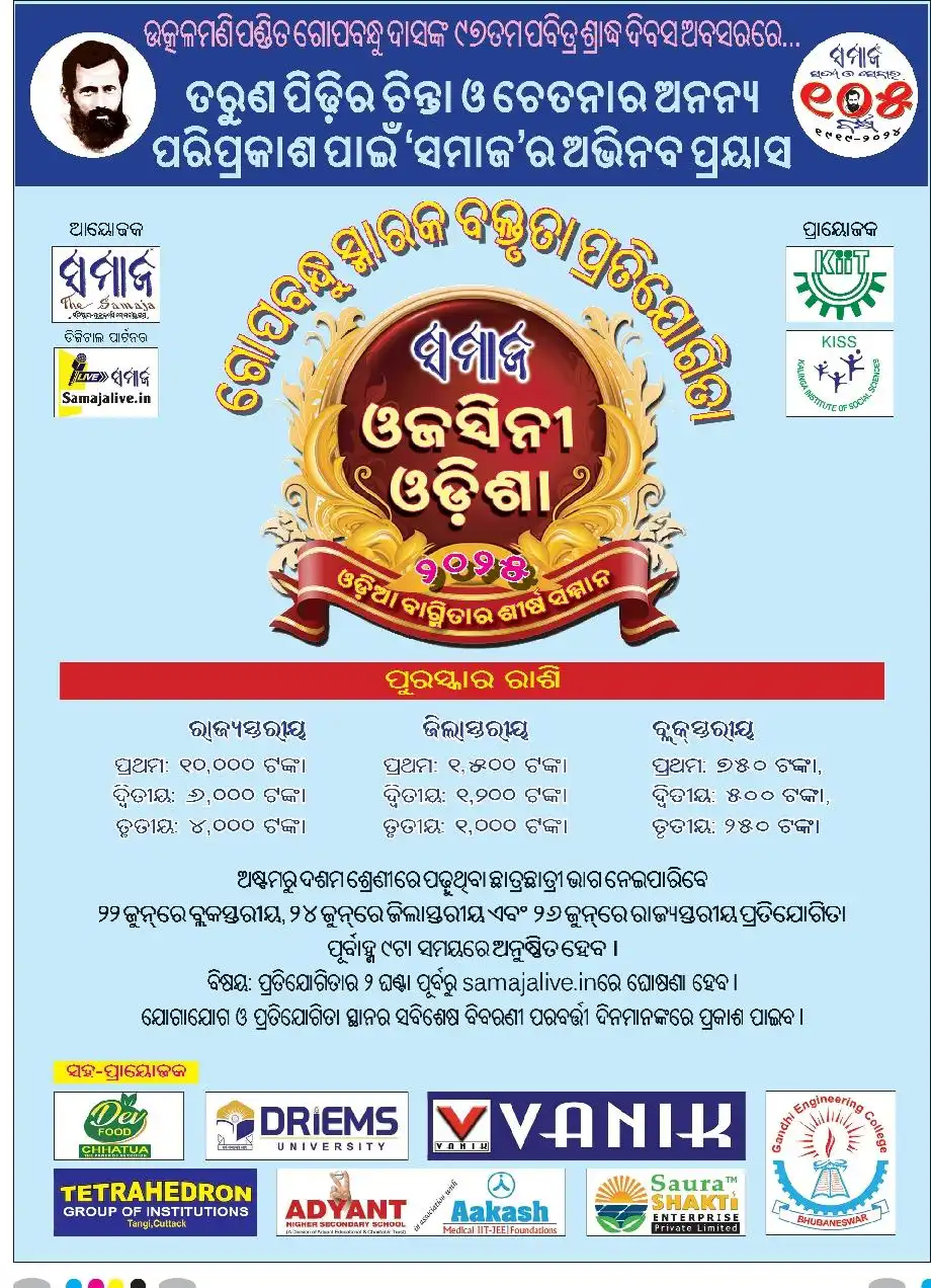 ଭୁବନେଶ୍ଵର: ଉତ୍କଳମଣି ପଣ୍ଡିତ ଗୋପବନ୍ଧୁ ଦାସଙ୍କ ୯୭ତମ ପବିତ୍ର ଶ୍ରାଦ୍ଧ ଦିବସ ଅବସରରେ ବକ୍ତୃତା ପ୍ରତିଯୋଗିତା ଅନୁଷ୍ଠିତ ହେଉଛି। ତରୁଣ ପିଢିର ଚିନ୍ତା ଓ ଚେତନାର ଅନନ୍ୟ ପରିପ୍ରକାଶ ପାଇଁ ସମାଜ ପକ୍ଷରୁ ଅଭିନବ ପ୍ରୟାସ କରାଯାଉଛି। ଏଥିରେ ଅଷ୍ଟମର ଦଶମ ଶ୍ରେଣୀରେ ପଢୁଥିବା ଛାତ୍ରଛାତ୍ରୀମାନେ ଭାଗ ନେଇପାରିବେ। ୨୨ ଜୁନରେ ବ୍ଲକସ୍ତରୀୟ , ୨୪ ଜୁନରେ ଜିଲ୍ଲାସ୍ତରୀୟ ଏବଂ ୨୬ ଜୁନରେ ରାଜ୍ୟସ୍ତରୀୟ ପ୍ରତିଯୋଗିତା ପୂର୍ବାହ୍ନ ୯ଟା ସମୟରେ ଅନୁଷ୍ଠିତ ହେବ। ପ୍ରତିଯୋଗିତାର ଦୁଇ ଘଣ୍ଟା ପୂର୍ବରୁ samajalive.inରେ ଘୋଷଣା ହେବ। ଯୋଗାଯୋଗ ଏବଂ ପ୍ରତିଯୋଗିତା ସ୍ଥାନର ସବିଶେଷ ବିବରଣୀ ପରବର୍ତ୍ତୀ ଦିନ ମାନଙ୍କରେ ପ୍ରକାଶ ପାଇବ।