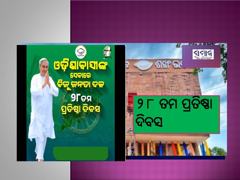 ଭୁବନେଶ୍ୱର : ଗୁରୁବାର ଡିସେମ୍ବର ୨୬ରେ ବିଜେଡି ଅର୍ଥାତ୍ ବିଜୁ ଜନତା ଦଳର ୨୮ ତମ ପ୍ରତିଷ୍ଠା ଦିବସ ।୨୭ ବର୍ଷର ସେବା ଦେଇଥିବା ବିଡେଡି ଦଳର ପ୍ରତିଷ୍ଠା ଦିବସ ଉପଲକ୍ଷେ ବିଭିନ୍ନ ସ୍ଥାନରେ ସ୍ୱତନ୍ତ୍ର କାର୍ଯ୍ୟକ୍ରମ ଅନୁଷ୍ଠିତ ହେଉଛି । ଏହାସହ ଶଙ୍ଖ ଭବନରେ ରାଜ୍ୟସ୍ତରୀୟ କାର୍ଯ୍ୟକ୍ରମ ଆୟୋଜିତ ହୋଇଛି । ପ୍ରବାଦ ପୁରୁଷ ବିଜୁ ପଟ୍ଟନାୟକଙ୍କ ବିକଶିତ ଓଡିଶାର ସ୍ୱପ୍ନକୁ ସାକାର କରିବାରେ ନବୀନଙ୍କ ଭୂମିକା ଖୁବ୍ ଗୁରୁତ୍ୱପୂର୍ଣ୍ଣ ରହିଛି ।