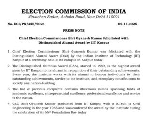 ସମାଜ ନ୍ୟୁଜ ଡେସ୍କ:- ଭାରତୀୟ ପ୍ରଶାସନିକ ସେବାରେ ଉଲ୍ଲେଖନୀୟ ଅବଦାନ, ଉତ୍କୃଷ୍ଟ ପ୍ରଶାସନିକ ଦକ୍ଷତା, ଦେଶ ଓ ଗଣତନ୍ତ୍ରକୁ ସୁଦୃଢ କରିବାର ଅବିସ୍ମରଣୀୟ ଅବଦାନ ପାଇଁ ଆଇଆଇଟି କାନପୁର ପକ୍ଷରୁ ମୁଖ୍ୟ ନିର୍ବାଚନ କମିଶନର ଶ୍ରୀ ଜ୍ଞାନେଶ କୁମାରଙ୍କୁ Distinguished Alumni Award (DAA) ସମ୍ମାନରେ ସମ୍ମାନିତ କରାଯାଇଛି।