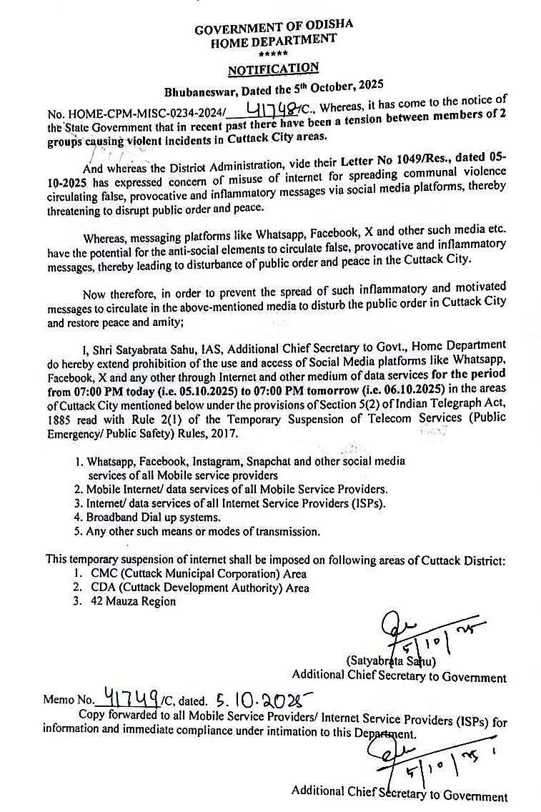 ଦଶହରା ଭସାଣ ଶୋଭାଯାତ୍ରା ସମୟରେ କଟକରେ ଘଟିଥିବା ଗଣ୍ଡଗୋଳ ଘଟଣା ପ୍ରତିବାଦରେ ସୋମବାର ସହରରେ ବନ୍ଦ ଡାକରା ଦିଆଯାଇଛି। ତେଣୁ ଆଇନଶୃଙ୍ଖଳା ପରିସ୍ଥିତିକୁ ଦୃଷ୍ଟିରେ ରଖି ସହରରେ ଇଣ୍ଟରନେଟ ସେବା ବନ୍ଦ କରିଦିଆଯାଇଛି। ରବିବାର ସନ୍ଧ୍ୟା ୭ଟାରୁ ସୋମବାର ସନ୍ଧ୍ୟା ୭ଟା ଯାଏ ନିଷ୍ପତ୍ତି ବଳବତ୍ତର ରହିବ ବୋଲି ଗୃହ ବିଭାଗ ପକ୍ଷରୁ ସୂଚନା ମିଳିଛି। ସେହିପରି ହ୍ବାଟ୍ସଆପ, ଫେସବୁକ, ଇନଷ୍ଟାଗ୍ରାମ, ଏକ୍ସ ଭଳି ଅନେକ ସାମାଜିକ ଗଣମାଧ୍ୟମ ଆପଗୁଡ଼ିକ ଉପରେ ମଧ୍ୟ କଟକଣା ଲାଗୁ ହୋଇଛି। ସିଡିଏ, ସିଏମସି ଏବଂ ବୟାଳିଶିମୌଜା ଅଞ୍ଚଳ ପାଇଁ ଏହି କଟକଣା ଲାଗୁ କରାଯାଇଛି।