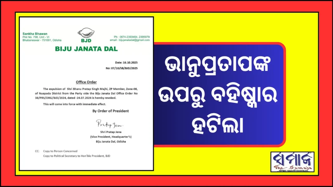 ସମାଜ ଡିଜିଟାଲ ଡେସ୍କ: ନୂଆପଡ଼ା ଜିଲାର ୮ ନମ୍ବର ଜୋନ ଜିଲା ପରିଷଦ ସଦସ୍ୟ ଭାନୁ ପ୍ରତାପ ସିଂହ ମାଝୀଙ୍କ ଉପରୁ ବିଜେଡିରୁ ବହିଷ୍କାର ଆଦେଶ ହଟାଇ ଦିଆଯାଇଛି। ଏ ନେଇ ବିଜେଡି ପକ୍ଷରୁ ଏକ ବିଜ୍ଞପ୍ତି ଜାରି କରି ସୂଚନା ଦିଆଯାଇଛି। ଦଳର ସଭାପତି ନବୀନ ପଟ୍ଟନାୟକଙ୍କ ନିର୍ଦେଶକ୍ରମେ ଏହି ପଦକ୍ଷେପ ଗ୍ରହଣ କରାଯାଇଥିବା କୁହାଯାଇଛି।