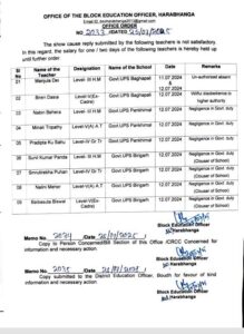 ହରଭଙ୍ଗା: ହରଭଙ୍ଗା ବ୍ଲକ ଅନ୍ତର୍ଗତ ବାଘପାଲି, ପନଖିମାଲ ଓ ବିରିଗଡ ଭଳି ତିନି ଗୋଟି ସ୍କୁଲର ୯ ଜଣ ଶିକ୍ଷକଙ୍କ କର୍ତ୍ତବ୍ୟରେ ଅବହେଳା ସେମାନଙ୍କୁ ମହଙ୍ଗା ପଡିଛି। ଶେଷରେ ହରଭଙ୍ଗା ବ୍ଲକ ଗୋଷ୍ଠୀ ଶିକ୍ଷାଧିକାରୀ ହାଡ଼ିବନ୍ଧୁ ବେହେରା ଉକ୍ତ ସ୍କୁଲର ୩ ଜଣ ପ୍ରଧାନଶିକ୍ଷକ ଏବଂ ୦୬ ଜଣ ଶିକ୍ଷକ, ଶିକ୍ଷୟିତ୍ରୀଙ୍କ ଦରମା ବନ୍ଦ ନିର୍ଦ୍ଦେଶ ଦେଇଥିବା ଜଣାପଡିଛି।
