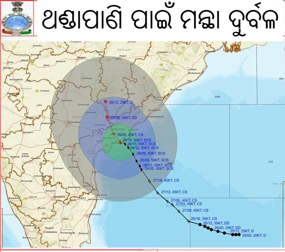 ମଙ୍ଗଳବାର ସକାଳେ ଘଣ୍ଟାପ୍ରତି ୧୫ କିମି ବେଗରେ ମାଡ଼ି ଆସୁଥିବା ‘ମୋନ୍ଥା’ ଅପରାହ୍ଣ ବେଳକୁ ହଠାତ୍ ମନ୍ଥର ହୋଇ ଯାଇଥିଲା । ଘୂର୍ଣ୍ଣିଝଡ଼ ମନ୍ଥା ହଠାତ୍ ଉପକୂଳ ନିକଟରେ ଦୁର୍ବଳ ହୋଇଗଲା । କାରଣ ବାତ୍ୟା ମଧ୍ୟରେ ଥଣ୍ଡା ପାଣି ପ୍ରବେଶ କରିଥିଲା ଏବଂ ବାୟୁ ସୁପ୍ତ ଉତ୍ତାପ ମୁକ୍ତ ହୋଇଥିଲା, ଫଳରେ ସମୁଦ୍ର ଜଳ ଉପଯୁକ୍ତ ତାପମାତ୍ରା ବଜାୟ ରଖିବା ପାଇଁ ଯଥେଷ୍ଟ ହେଲା ନାହିଁ । ଏହାପରେ ଗତ ତିନି ଘଣ୍ଟା ମଧ୍ୟରେ ମେଘ ପଶ୍ଚିମ ଦିଗକୁ ଗତି କରୁଛି ଏବଂ ଆନ୍ଧ୍ର ପ୍ରଦେଶ ସଂଲଗ୍ନ ଦକ୍ଷିଣ ଓଡ଼ିଶାରେ ସ୍ପଷ୍ଟ ହେଉଛି। ତେଣୁ, ଆଜିଠାରୁ ଅକ୍ଟୋବର 30 ତାରିଖ ପର୍ଯ୍ୟନ୍ତ ଓଡ଼ିଶାର ଦକ୍ଷିଣ ଏବଂ ପଶ୍ଚିମ ଅଂଶ ସମେତ ଆଭ୍ୟନ୍ତରୀଣ ଜିଲ୍ଲାଗୁଡ଼ିକରେ ହାଲୁକାରୁ ମଧ୍ୟମ ବର୍ଷା ହୋଇପାରେ। ତଥାପି, ଏହି ସମୟ ମଧ୍ୟରେ ପ୍ରବଳ ଝଡ଼ବର୍ଷା ହୋଇପାରେ। ଭୁବନେଶ୍ୱର ସମେତ ଉପକୂଳବର୍ତ୍ତୀ ଜିଲ୍ଲାଗୁଡ଼ିକରେ ଆସନ୍ତାକାଲି ହାଲୁକାରୁ ମଧ୍ୟମ ବର୍ଷା ହୋଇପାରେ।