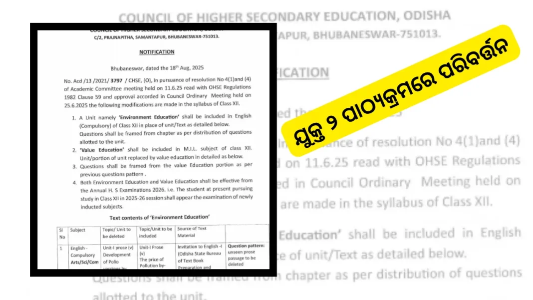 ଯୁକ୍ତ ୨ ପାଠ୍ୟକ୍ରମରେ ପରିବର୍ତ୍ତନ, ବାଧ୍ୟତାମୂଳକ ଇଂରାଜୀରେ ରହିବ ‘ପରିବେଶ ଶିକ୍ଷା’ ୟୁନିଟ୍, MIL ବିଷୟରେ ଅନ୍ତର୍ଭୁକ୍ତ ହେଲା ‘ମୂଲ୍ୟବୋଧ ଶିକ୍ଷା’ ୟୁନିଟ୍, ୨୦୨୬ ବୋର୍ଡ ପରୀକ୍ଷାରେ ଉଭୟ ବିଷୟରେ ପ୍ରଶ୍ନ ଆସିବ, ଉଚ୍ଚ ମାଧ୍ୟମିକ ଶିକ୍ଷା ପରିଷଦ ପକ୍ଷରୁ ବିଜ୍ଞପ୍ତି…