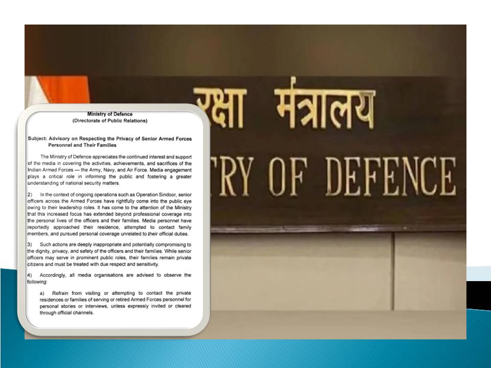 ସେନା କର୍ମଚାରୀଙ୍କ ବ୍ୟକ୍ତିଗତ ତଥ୍ୟ ଯେପରିକି ବାସସ୍ଥାନ ଠିକଣା, ପରିବାର ସଦସ୍ୟଙ୍କ ଫଟୋ ନେବା ଠାରୁ ଦୂରେଇ ରହିବାକୁ ପରାମର୍ଶ ଦେଇଛି ପ୍ରତିରକ୍ଷା ମନ୍ତ୍ରଣାଳୟ । ଜାତୀୟ ସୁରକ୍ଷାକୁ ଦୃଷ୍ଟିରେ ରଖି ଏସମ୍ପର୍କିତ ଗୋପନୀୟତା ରକ୍ଷା କରିବା ପାଇଁ ଗଣମାଧ୍ୟମକୁ ଦାୟିତ୍ୱପୂର୍ଣ୍ଣ ସାମ୍ବାଦିକତାର ମାନଦଣ୍ଡ ବଜାୟ ରଖିବାକୁ ଆଡଭାଇଜରୀରେ କୁହାଯାଇଛି ।