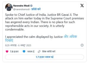 ନୂଆଦିଲ୍ଲୀ : ପ୍ରଧାନ ବିଚାରପତିଙ୍କ ଉପରକୁ ଆକ୍ରମଣ ଉଦ୍ୟମ ପରେ ପ୍ରଧାନମନ୍ତ୍ରୀ ମୋଦୀ ଜଷ୍ଟିସ୍ ଗଭଇଙ୍କ ସହ ଆଲୋଚନା କରିଛନ୍ତି। ମୋଦୀ ସାମାଜିକ ଗଣମାଧ୍ୟମ ଏକ୍ସ ଜରିଆରେ କହିଛନ୍ତି କି ‘ମୁଁ ପ୍ରଧାନ ବିଚାରପତିଙ୍କ ସହ ଆଲୋଚନା କରିଛି। ସୁପ୍ରିମକୋର୍ଟରେ ତାଙ୍କ ଉପରେ ଆକ୍ରମଣ ପ୍ରତି ଭାରତୀୟଙ୍କୁ ଅସନ୍ତୁଷ୍ଟ କରିଛି। ଆମ ସମାଜରେ ଏଭଳି ନିନ୍ଦନୀୟ କାର୍ଯ୍ୟ ପାଇଁ କୌଣସି ସ୍ଥାନ ନାହିଁ। ଏହା ଅତ୍ୟନ୍ତ ଲଜ୍ଜାଜନକ।’