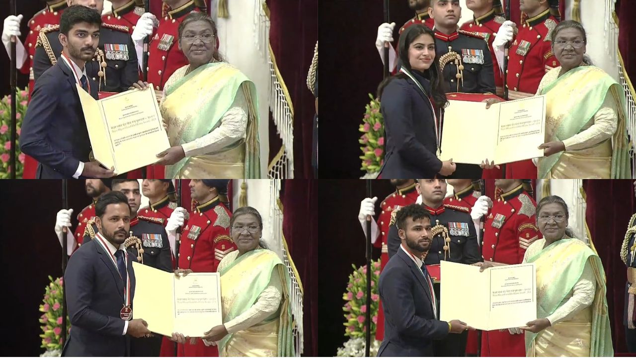 ନୂଆଦିଲ୍ଲୀ: ରାଷ୍ଟ୍ରପତି ଦ୍ରୌପଦୀ ମୁର୍ମୁ ଶୁକ୍ରବାର ରାଷ୍ଟ୍ରୀୟ କ୍ରୀଡ଼ା ପୁରସ୍କାର ପୁରସ୍କାର ପ୍ରଦାନ କରିଛନ୍ତି। ରାଷ୍ଟ୍ରପତି ଭବନରେ ଆୟୋଜିତ ସ୍ଵତନ୍ତ୍ର କାର୍ଯ୍ୟକ୍ରମରେ ପ୍ୟାରିସ୍ ଅଲିମ୍ପିକ୍ରେ ଦୁଇ ଦୁଇଟି ପଦକ ଜିତିଥିବା ମହିଳା ସୁଟର ମନୁ ଭାକର ଓ ବିଶ୍ଵ ଚେସ୍ ଚମ୍ପିଆନ୍ ଡି. ଗୁକେଶଙ୍କ ସମେତ ୪ ଜଣ ଖେଳାଳିଙ୍କୁ ଖେଳ ରତ୍ନ ପୁରସ୍କାରରେ ସମ୍ମାନିତ କରାଯାଇଛି। ପୁରସ୍କାର ବିତରଣ ସମାରୋହରେ କ୍ରୀଡ଼ା ମନ୍ତ୍ରୀ ମନସୁଖ ମାଣ୍ଡବ୍ୟ ମଧ୍ୟ ଉପସ୍ଥିତ ଥିଲେ।