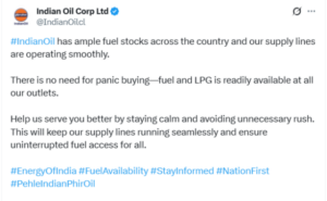 ସମାଜ ଡିଜିଟାଲ ଡେସ୍କ: ଭାରତ ଓ ପାକିସ୍ତାନ ଉତ୍ତେଜନା ପରିସ୍ଥିତି ମଧ୍ୟରେ ଦେଶବାସୀଙ୍କୁ ଆତଙ୍କିତ ନହେବାକୁ ସବୁ ବିଭାଗ ପକ୍ଷରୁ ପରାମର୍ଶ ଦିଆଯାଉଛି । ଦେଶରେ ତେଲ ପ୍ରଚୁର ପରିମାଣରେ ମହଜୁଦ ରହିଛି ଲୋକମାନେ ଆତଙ୍କିତ ନହେବାକୁ ଆଇଓସିଏଲ୍ ପକ୍ଷରୁ ପରାମର୍ଶ ଦିଆଯାଇଛି । ଦେଶସାରା ଇଣ୍ଡିଆନ ଅଏଲର ପ୍ରଚୁର ଇନ୍ଧନ ମହଜୁଦ ରହିଛି । ଯୋଗାଣ ଲାଇନ ଗୁଡିକ ସୁଗମ ଭାବରେ କାର୍ଯ୍ୟ କରୁଛି । ସମସ୍ତ ଆଉଟଲେଟରେ ଇନ୍ଧନ ଏବଂ ଏଲପିଜି ସହଜରେ ଉପଲବ୍ଧ ରହିଛି ବୋଲି କୁହାଯାଇଛି ।