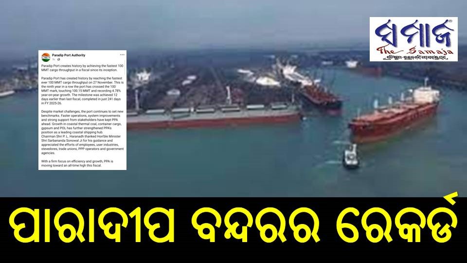 ସମାଜ ଲାଇଭ ଡ଼େସ୍କ : ଓଡ଼ିଶାର ସର୍ବବୃହତ ବନ୍ଦର “ପାରାଦୀପ ବନ୍ଦର” ଇତିହାସ ସୃଷ୍ଟି କରିଛି । ଗତ ୨ବର୍ଷ ଭଳି ଏବର୍ଷ ମଧ୍ୟ ୧୦୦ ମିଲିୟନ ମେଟ୍ରିକ ଟନ ପଣ୍ୟ କାରବାର କରିଛି ପାରାଦୀପ ବନ୍ଦର । ଏବର୍ଷ ଆର୍ଥିକବର୍ଷ ଶେଷ ହେବା ପୂର୍ବରୁ ୧୦୦ ମିଲିୟନ ମେଟ୍ରିକ ଟନ କାରବାର କରି ପାରିଛି ବନ୍ଦର । ଗତ ଆର୍ଥିକ ବର୍ଷ ତୁଳନାରେ ୧୨ ଦିନ ପୂର୍ବରୁ ରେକର୍ଡ ହାସଲ କରି ପାରିଛି ବନ୍ଦର । ଗତକାଲି ସୁଦ୍ଧା ସବୁଠୁ ଅଧିକ କାର୍ଗୋ ପରିବହନ କରି ରେକର୍ଡ ସୃଷ୍ଟି କରିପାରିଛି ବନ୍ଦର । ଏନେଇ ପାରାଦୀପ ବନ୍ଦର ପକ୍ଷରୁ ସାମାଜିକ ଗଣମାଧମରେ ସୂଚନା ଦିଅଯାଇଛି ।