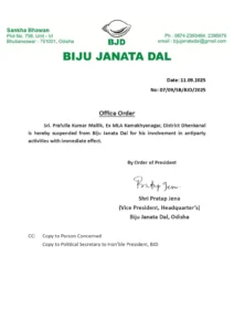 ସମାଜ ଡିଜିଟାଲ ଡେସ୍କ: ବିଜେଡି ଦଳରୁ ନିଲମ୍ବିତ ହେଲେ ପୂର୍ବତନ ମନ୍ତ୍ରୀ ତଥା ଟାଣୁଆ ନେତା ପ୍ରଫୁଲ୍ଲ ମଲ୍ଲିକ । ଦଳର ଉପସଭାପତି ପ୍ରତାପ ଜେନା ତାଙ୍କୁ ନିଲମ୍ବନ କରିଛନ୍ତି । ଦଳ ବିରୋଧୀ କାର୍ଯ୍ୟ ପାଇଁ ଦଳରୁ ନିଲମ୍ବନ ନେଇ ପ୍ରେସ୍ ବିଜ୍ଞପ୍ତିରେ ସୂଚନା ଦିଆଯାଇଛି ।