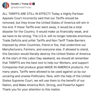 ସେପଟେ ଫେଡେରାଲ୍‍ କୋର୍ଟର ନିଷ୍ପତ୍ତି ଶୁଣିବା ପରେ ରାଷ୍ଟ୍ରପତି ଟ୍ରମ୍ପ ପ୍ରତିକ୍ରିୟା ରଖିଛନ୍ତି । ସୋସିଆଲ ମିଡ଼ିଆ ଏକ୍ସରେ ପୋଷ୍ଟ କରି ଟ୍ରମ୍ପ କହିଛନ୍ତି ସମସ୍ତ ଦେଶ ଉପରେ ଲାଗୁ ହୋଇଥିବା ଶୁଳ୍କ ପ୍ରଯୁଜ୍ୟ ଏବଂ ଏହା ସେହିପରି ରହିବ । ଫେଡେରାଲ କୋର୍ଟ ଅତ୍ୟନ୍ତ ପକ୍ଷପାତିତା କରିଛନ୍ତି । କୋର୍ଟ କହିଛନ୍ତି ଯେ ଶୁଳ୍କ ହଟାଇବା ଉଚିତ, କିନ୍ତୁ ମୁଁ ଜାଣେ ଯେ ଆମେରିକା ଶୁଳ୍କ ଯୁଦ୍ଧରେ ଜିତିବ । ଯଦି ୯୦ଟି ଦେଶ ଉପରେ ଲାଗୁ ହୋଇଥିବା ଶୁଳ୍କ ହଟାଇ ଦିଆଯାଏ , ତେବେ ଏହା ଆମେରିକା ପାଇଁ ଏକ ବଡ଼ ବିପର୍ଯ୍ୟୟ ହେବ ।