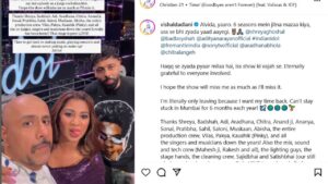 ବିଶାଲ ଇନଷ୍ଟାଗ୍ରାମରେ ପୋଷ୍ଟ ଶେୟାର କରି ତାଙ୍କ ଯାତ୍ରାକୁ ମନେ ପକାଇଛନ୍ତି। ଗାୟକ ଲେଖିଛନ୍ତି, ‘‘ବିଦାୟ ବନ୍ଧୁଗଣ। ୬ ସିଜନ୍‌ରେ ଯେତିକି ମଜା କରିଛି, ତା’ଠାରୁ ଅଧିକ ମନେ ପଡ଼ିବ। ଏହି ଶୋ’ ମୋତେ ମୋର ଯୋଗ୍ୟତାଠାରୁ ଅଧିକ ପ୍ରେମ ଏବଂ ସମ୍ମାନ ଦେଇଛି, ଏଥିପାଇଁ ମୁଁ ସର୍ବଦା କୃତଜ୍ଞ ରହିବି।’’